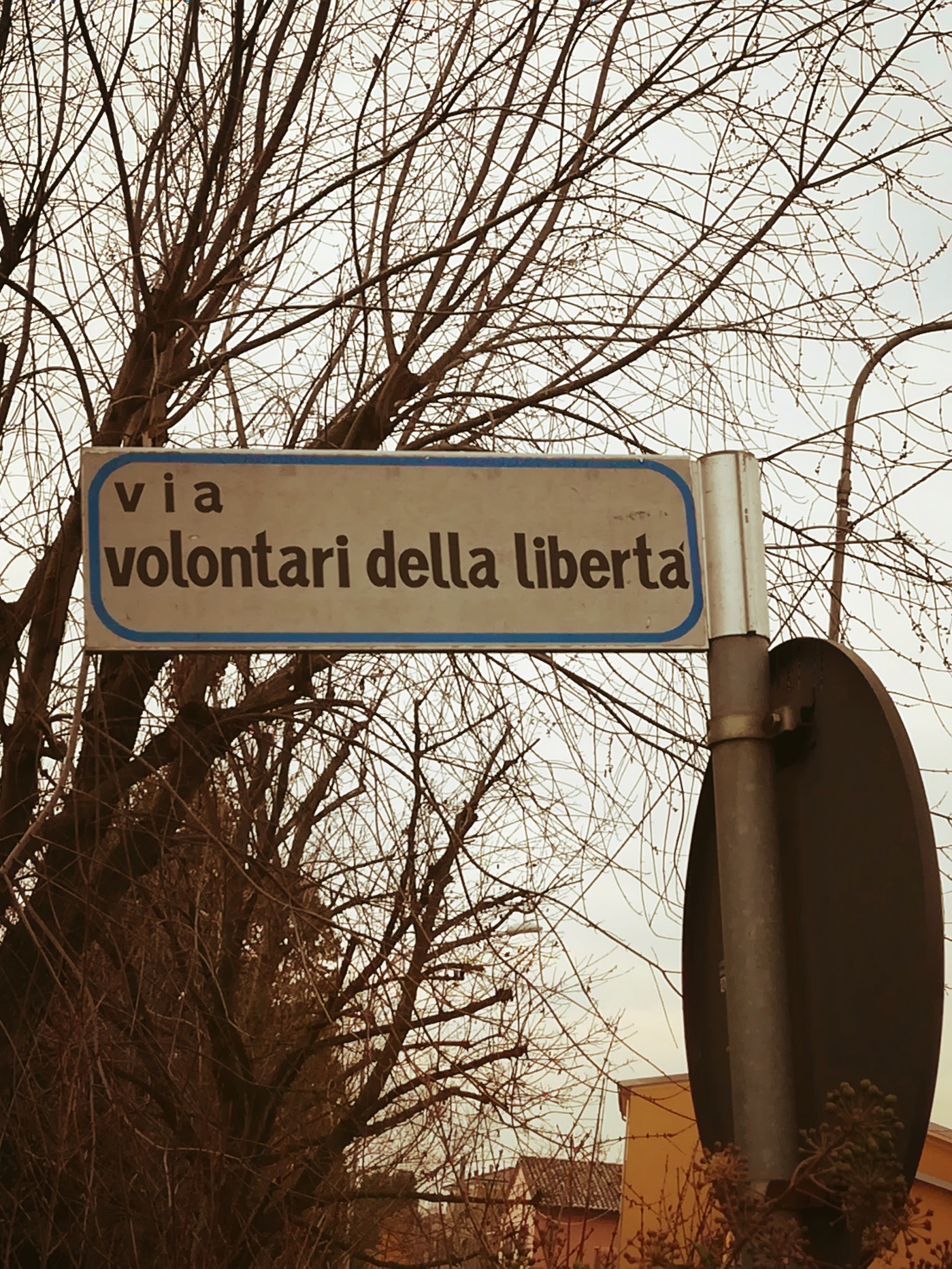 Io scelgo la nostra Via Volontari della Libertà (che più nostra non si può), per entrare nei nostri giorni, nel nostro tempo immemore. Che se la imbocchi dalle case di Campegine c’è scritto “strada senza uscita”… Ma se la prendi invece dall’argine, dal verso antico… dall’inizio… è invece una strada con un unico senso: quello della storia, quello giusto.